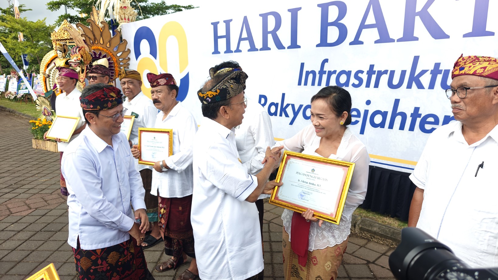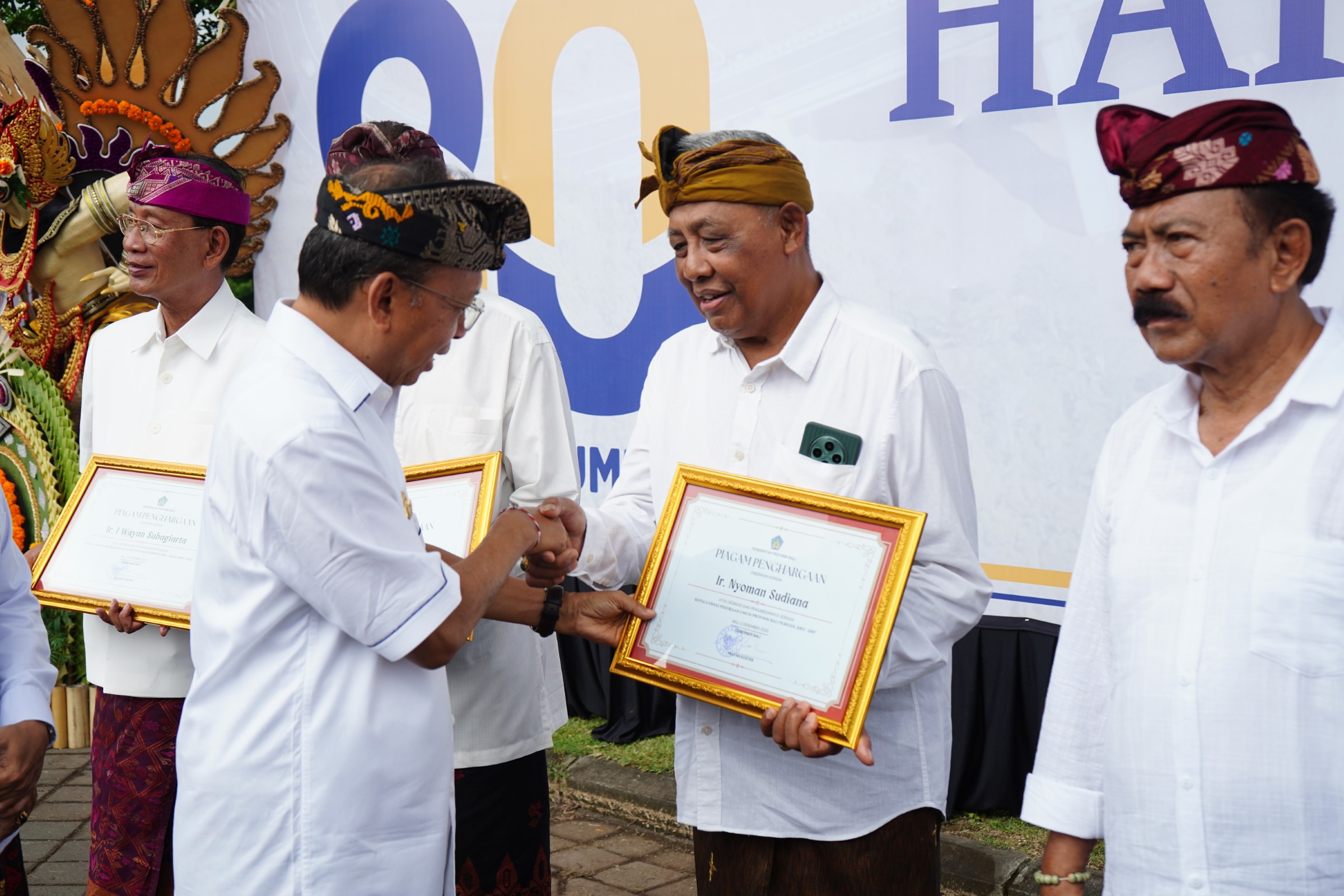 Rangkaian acara peringatan Hari Bakti PU ke-80 ini terasa semakin istimewa dengan adanya sesi tambahan berupa penyerahan penghargaan. Sebagai wujud penghormatan terhadap sejarah dan dedikasi, Pemerintah Provinsi Bali memberikan penghargaan khusus kepada para Mantan Kepala Dinas PUPR Provinsi Bali. Penghargaan ini merupakan bentuk terima kasih atas fondasi pembangunan yang telah diletakkan oleh para pendahulu.