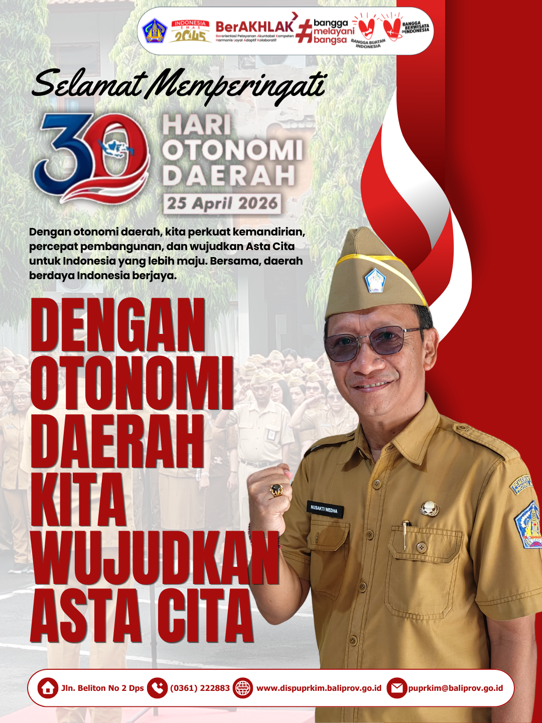 “Selamat Hari Otonomi Daerah ke-30. Mari kita jadikan momentum ini untuk memperkuat tata kelola pemerintahan yang bersih dan inovatif demi mewujudkan kesejahteraan masyarakat Bali yang berkeadilan,” tutup Kepala Dinas PUPRKIM dalam amanatnya.