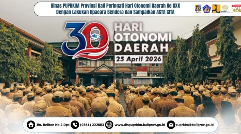 DENPASAR – Menindaklanjuti instruksi Pemerintah Provinsi Bali melalui Surat Sekretariat Daerah Nomor B.36.100/19212/PEM.OTDA/B.PEMKESRA , Dinas Pekerjaan Umum, Penataan Ruang, Perumahan dan Kawasan Permukiman (PUPRKIM) Provinsi Bali menyelenggarakan Upacara Peringatan Hari Otonomi Daerah ke-30 pada Senin, 27 April 2026.