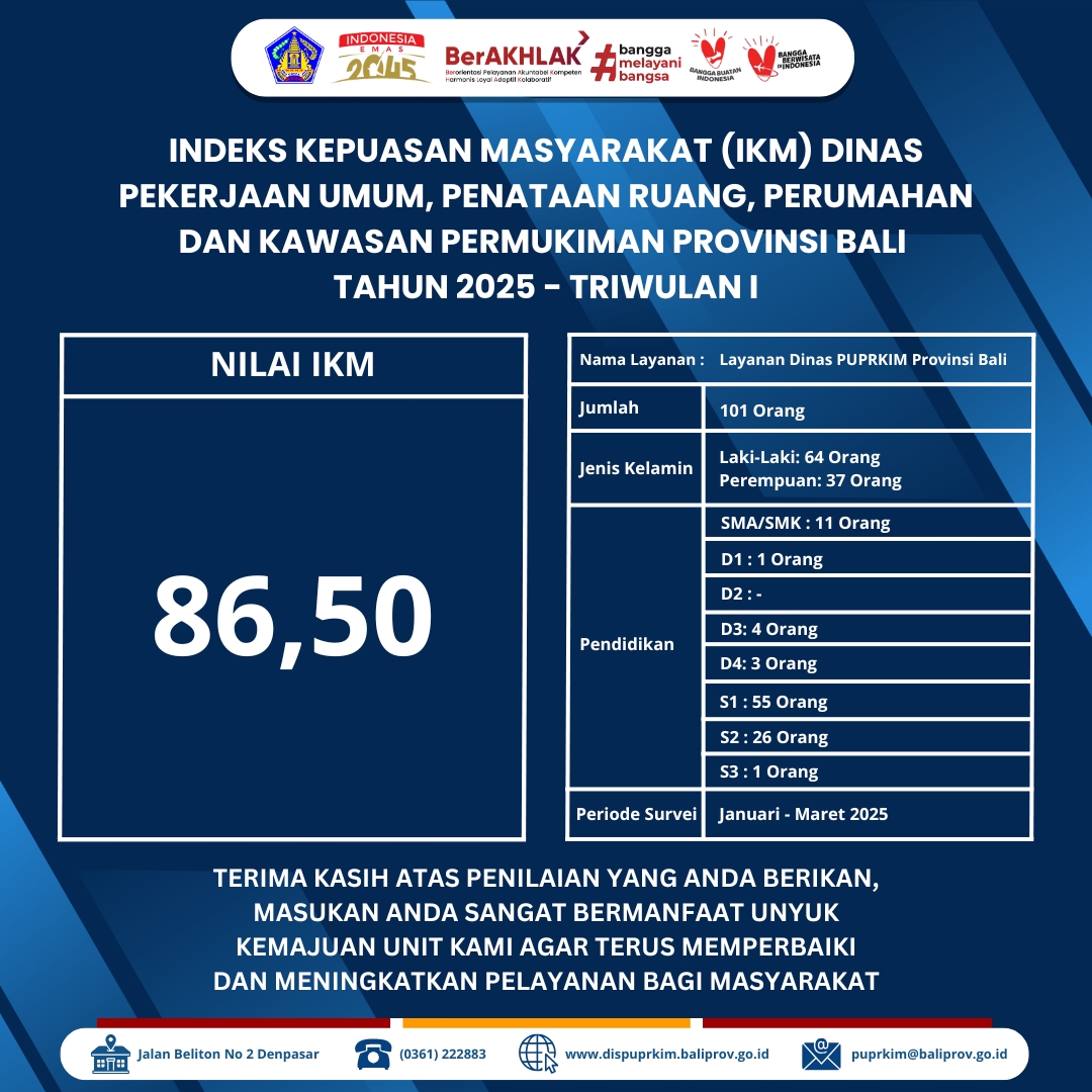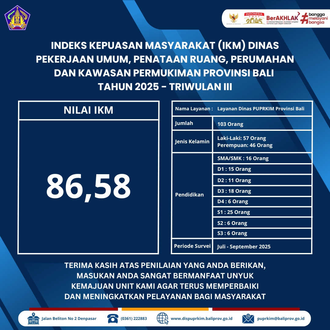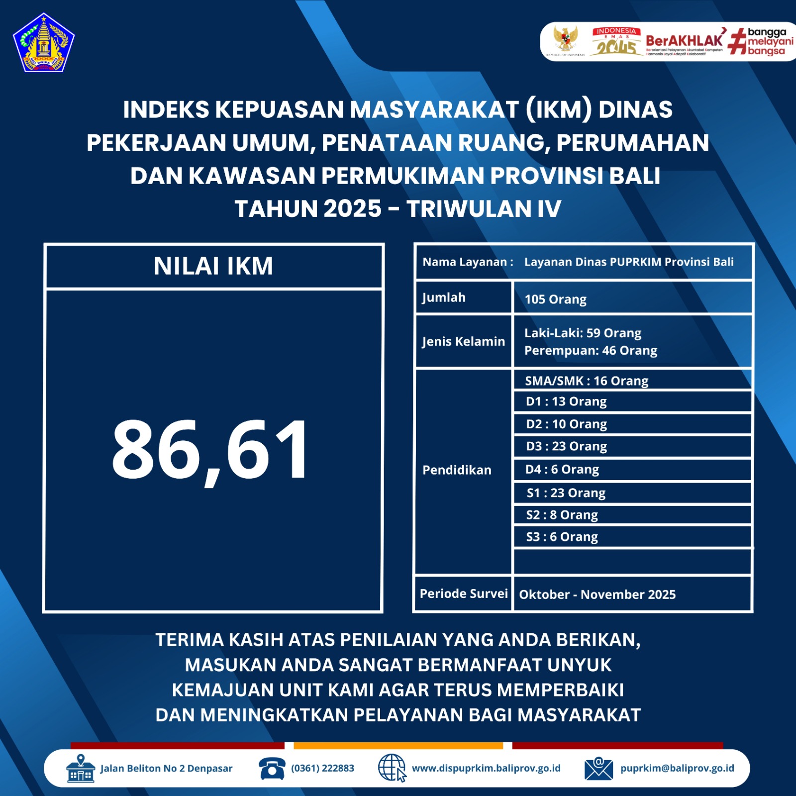 Melalui pelaksanaan SKM yang berkesinambungan ini, Dinas PUPRKIM Provinsi Bali berhasil membangun sistem penyelenggaraan pelayanan publik yang lebih akuntabel dan transparan. Peningkatan nilai indeks yang terus berlanjut hingga akhir tahun 2025 menjadi bukti nyata bahwa strategi intervensi dan continuous improvement yang diterapkan telah berjalan efektif. Ke depannya, Dinas PUPRKIM berkomitmen untuk terus berinovasi dalam mewujudkan pelayanan prima bagi seluruh masyarakat Bali.